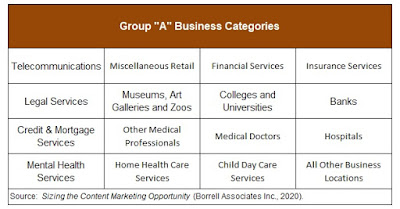 The Borrell report also provides detailed estimates for 100 distinct types of businesses. Borrell placed each type of business into one of six groups based on how likely that type of business is to engage in content marketing and what percentage of their marketing budget is devoted to content marketing. Borrell used the letters "A" through "F" to identify the six groups.